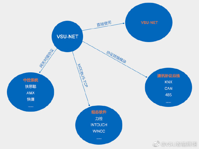 VSU智能照明控制系統通過自主研發的VSU-NET通訊協議可以做到單獨自組解決方案,同時也可以與市場上不同通訊協議的系統搭配,實現靈活多樣的行業智能化控制解決方案。 VSU的VSU-NET總線產品,大都采用雙總線口的設計,搭配連接片使用,極大降低施工人員接線的工作量,產品設計合理專業、系統、更加人性化;系統配置免編程,手機即可完成簡單的系統編程,不需要電腦,人機互動,真正實現智能化控制!