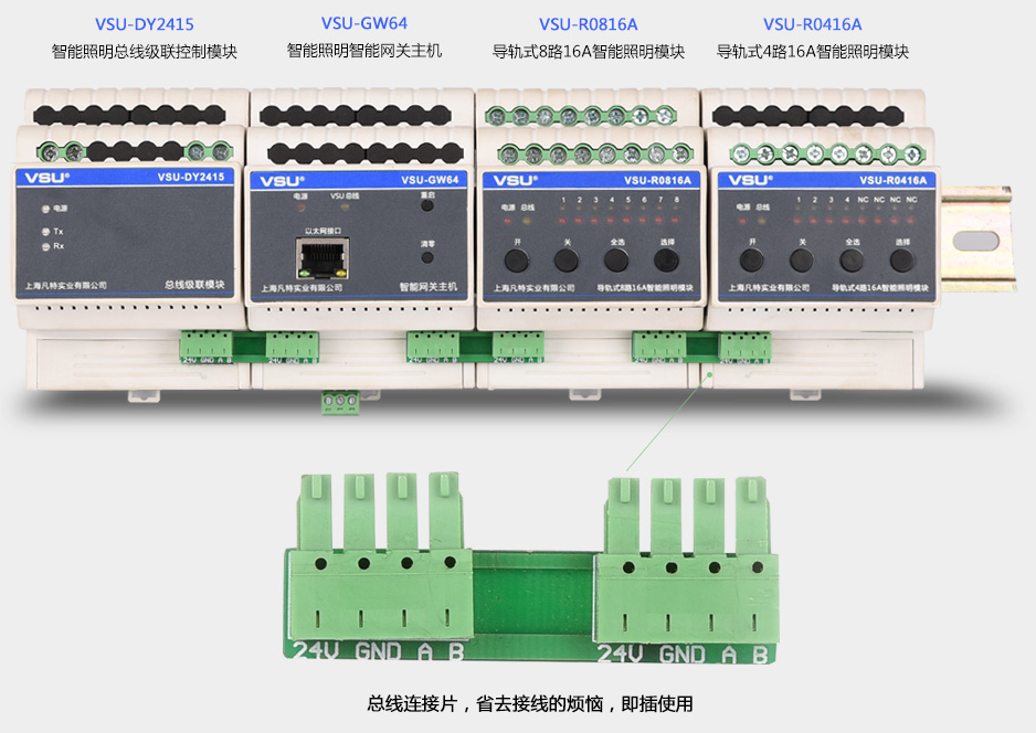 VSU-NET總線產品,大都采用雙總線口的設計,搭配連接片使用,極大降低施工人員接線的工作量,產品設計合理專業、系統、更加人性化;系統配置免編程,手機即可完成簡單的系統編程,不需要電腦,人機互動,真正實現智能化控制。