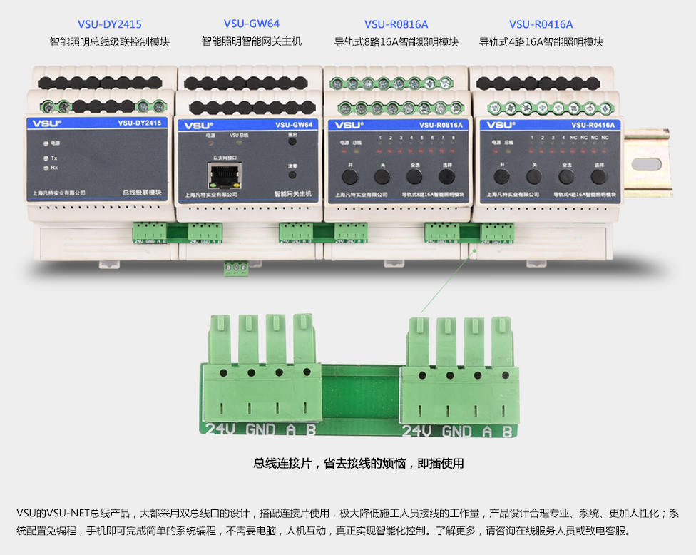 (6)網關主機通過網絡與IPAD、Andriod觸屏組成強大的控制系統;通過VSU-Net總線與智能按鍵面板、有線觸屏形成可靠的智能控制系統。