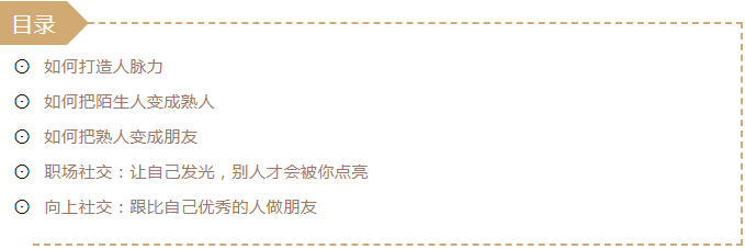 你認識誰比你知道什么更重要,愿意為你搭橋、為你背書、助你成功這才是真正有意義的人脈。保有一顆孩童般的好奇心,對世界、對他人真正的感興趣,渴望通過人和人的交往看到更廣闊的的世界,通過對人的深入了解而認識他們的本真。真誠、溫暖是敲門磚。把你的真誠用言語、行動,傳達給對方,讓對方感受到你的光和溫度,被你吸引。為他人創造價值是引路燈,做事絕不要從利己和功利的角度出發,而是首先想到如何為對方創造價值。