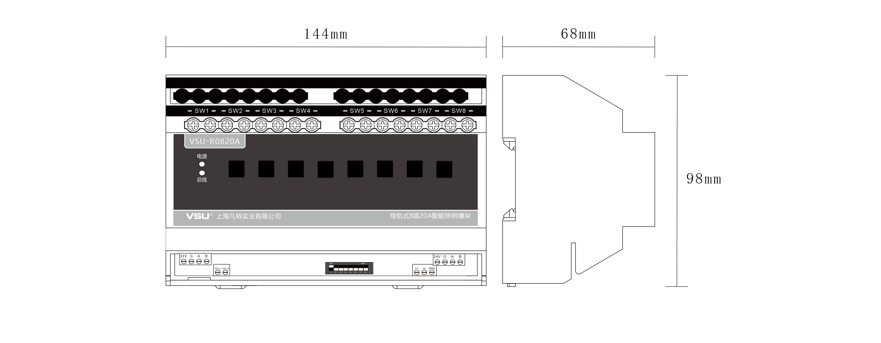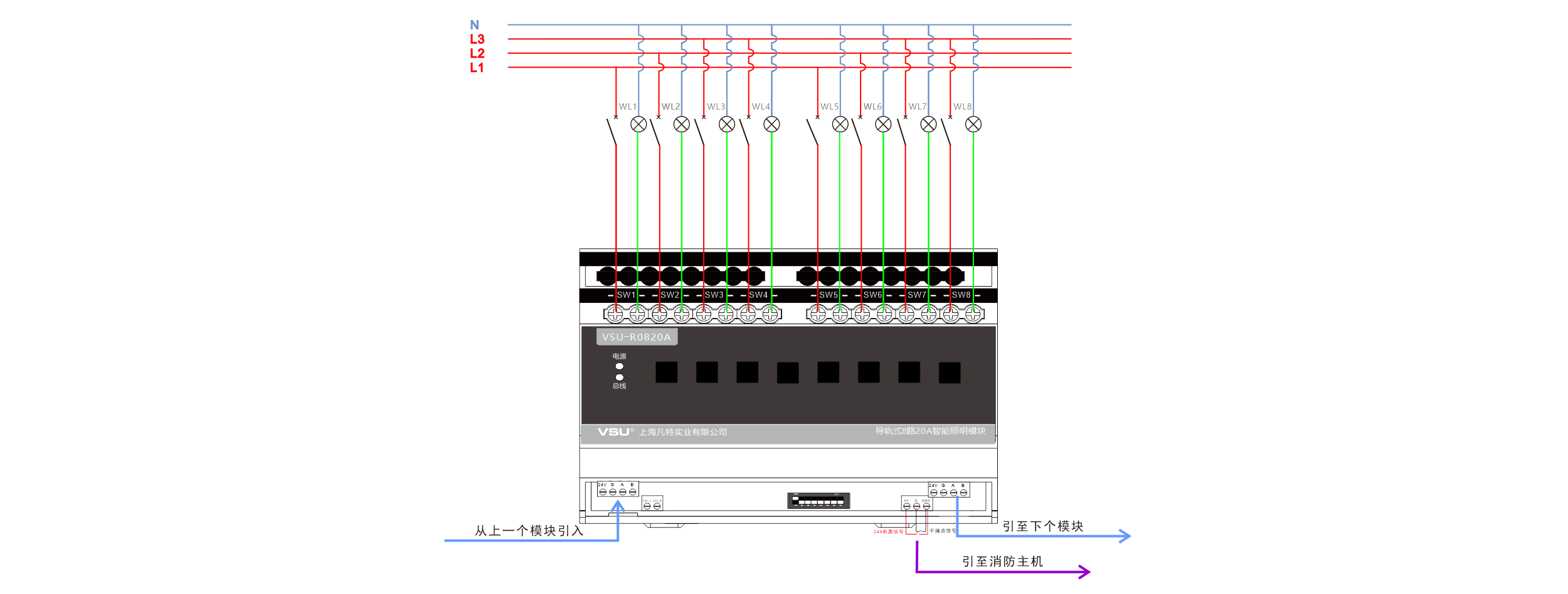 本產品為導軌式安裝,含8路智能繼電器,每回路可獨立控制4400W燈具的開關,帶應急按鍵,LED燈時時指示各個回路開關狀態,可設置為互鎖控制4組窗簾開合;