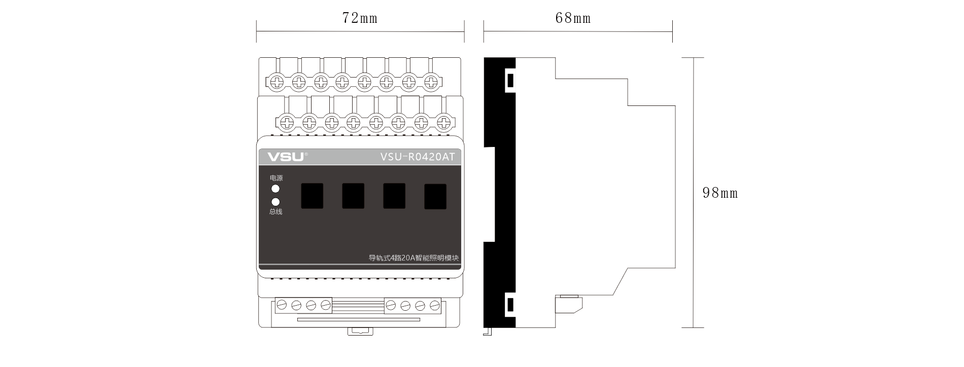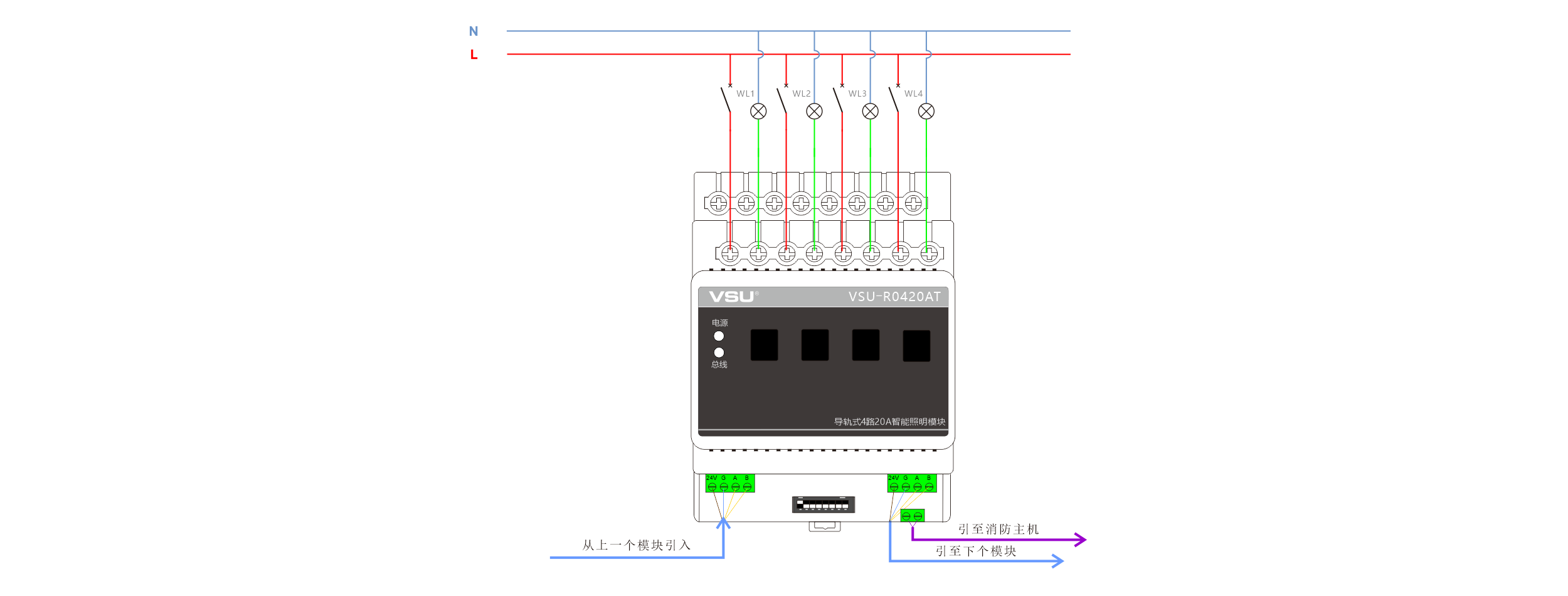 本產品為導軌式安裝,含4路智能繼電器,每回路可獨立控制4400W燈具的開關,帶強切功能和互鎖功能。