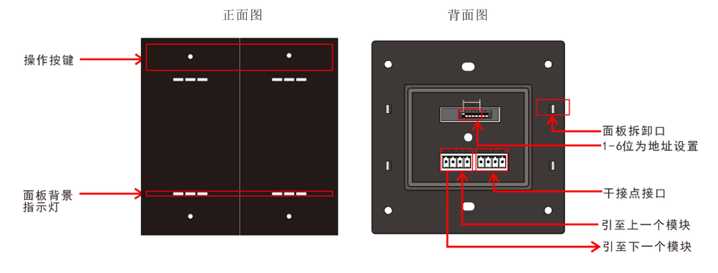 標準86底盒安裝,支持無縫聯接,提供4鍵,每個按鍵帶1路LED指示燈,復位式輕觸開關,結構成熟,性能穩定,標準工藝,采用塑料材質(顏色可選灰色、黑色和香檳金);自帶感應式背光燈;提供兩路IO輸入可外接傳感器。