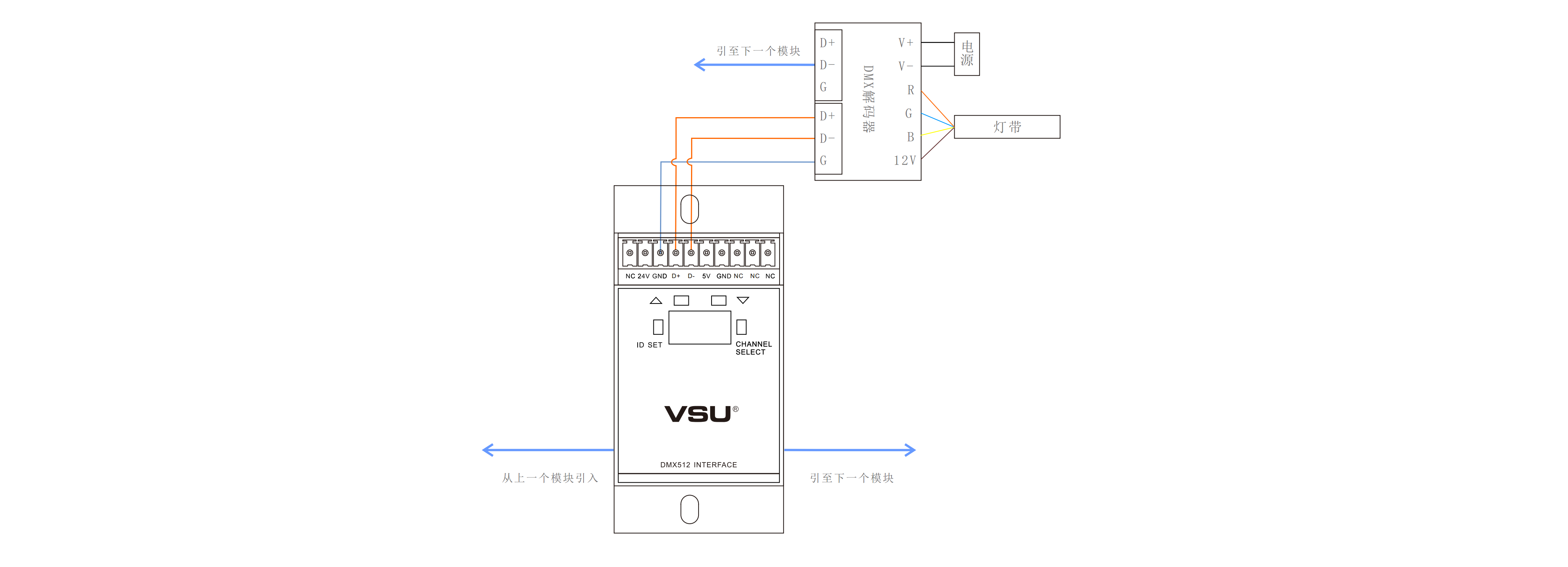 本產品通過VSU-Net總線控制DMX512信號的設備,可控制32個DMX通道,自帶場景功能,可查詢各個回路狀態;可給LED燈帶、RGB燈帶調光、調色;
